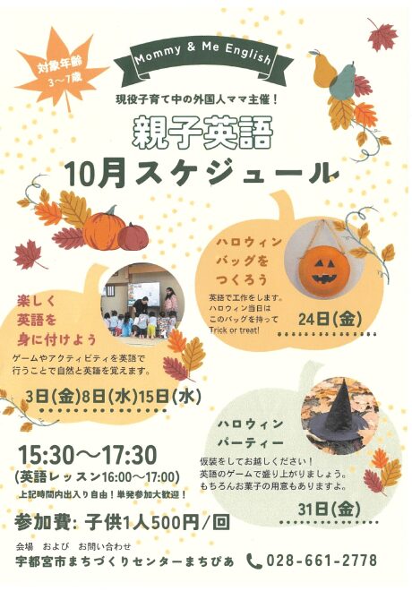 日時 | 10月スケジュール 3日、8日、15日、24日、31日 15:30~17:30(英語レッスン16:00~17:00) 時間内出入り自由!単発参加歓迎! |