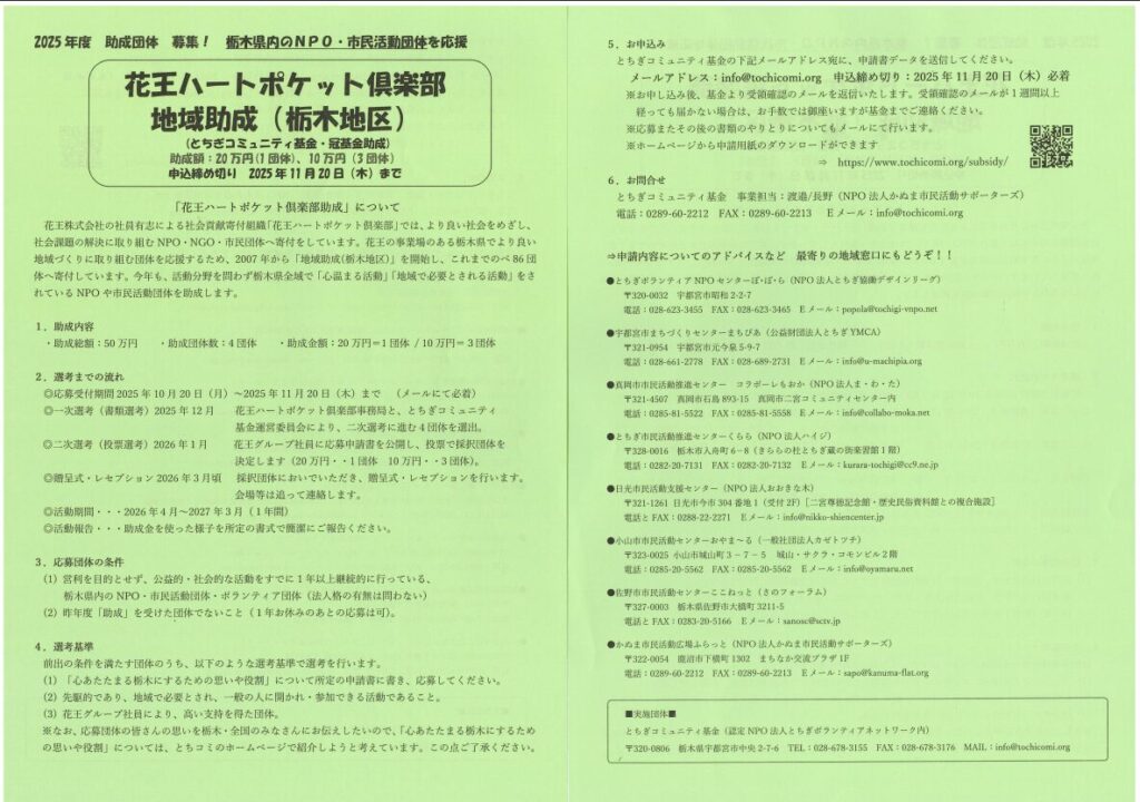 花王株式会社の社員有志による社会貢献寄付組織「花王ハートポケット倶楽部」では、より良い社会をめざし、社会課題の解決に取り組むNPO・NGO・市民団体へ寄付しています。花王の事業場のある栃木県でより良い地域づくりに取り組む団体を応援するため、2007年から「地域助成(栃木地区)」を開始し、これまでのべ86団体へ寄付しています。今年も、活動分野を問わず栃木県全域で「心温まる活動」「地域で必要とされる活動」をされているNPOや市民活動団体を助成します。