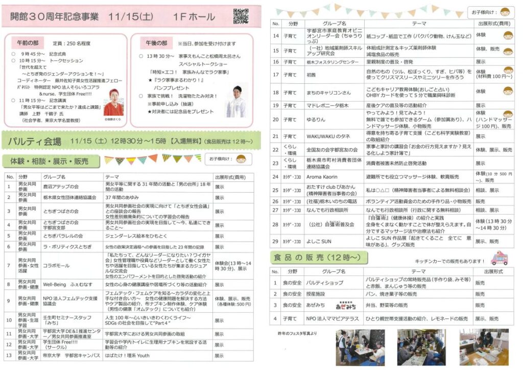 内 容 | <開館30周年記念事業> おかげさまでパルティは開館30年目を迎えました。 パルティホールにて、記念事業を開催します。 <ワークショップ・体験・展示・販売など> ジェンダー平等、子育て応援、カラダ・ココロ、食、くらしをテーマに様々なイベントを開催! ワークショップ、展示、相談、販売、親子で楽しめるコーナーもたくさん。 食品販売やキッチンカーもあります。 ご来場、お待ちしています!(入場無料) |