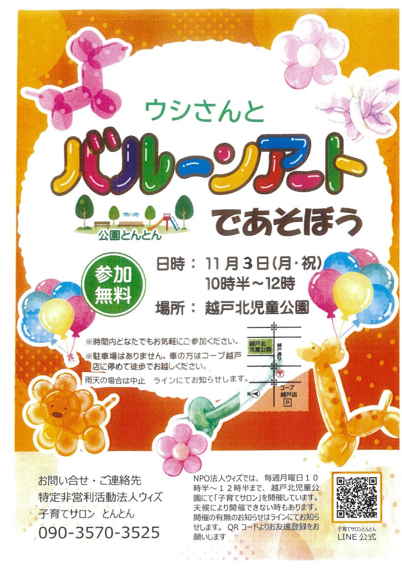 11/3(月・祝) ウシさんとバルーンアートであそぼう! 2025 10/10 イベント情報 まちづくり 2025年10月10日 内容 日時2025年11月3日(月・祝) 10:30~12:00 場所越戸北児童公園 参加費無料 お問い合わせ先特定非営利活動法人ウィズ子育てサロン とんとん☎ 090-3570-3525 イベント情報 まちづくり よかったらシェアしてね! URLをコピーしました! 【報 告】学校の外の文化祭ミニinトライ東を開催しました!✨ サークル会員募集 【算数・数学研究会】 関連記事 「口笛はじめてみませんか?」ハート&リレーション メンバー募集♪ 2025年10月13日 10/11(土) 地域に広がれ!こどもの居場所 2025年10月10日 「宮の朝活第25団」 趣味と習慣で毎日をレベルアップ♪ 2025年10月10日 11月8日(土) 第14回 南としょかん祭り 2025年10月10日 サークル会員募集 【算数・数学研究会】 2025年10月10日 10/24(金) こねっこ親の会 2025年10月5日 11月15日(土) 2025 Festa in Parti 2025年10月4日 11月29日(土) FPフォーラム2025&金融広報委員会講演会in栃木 2025年10月4日
