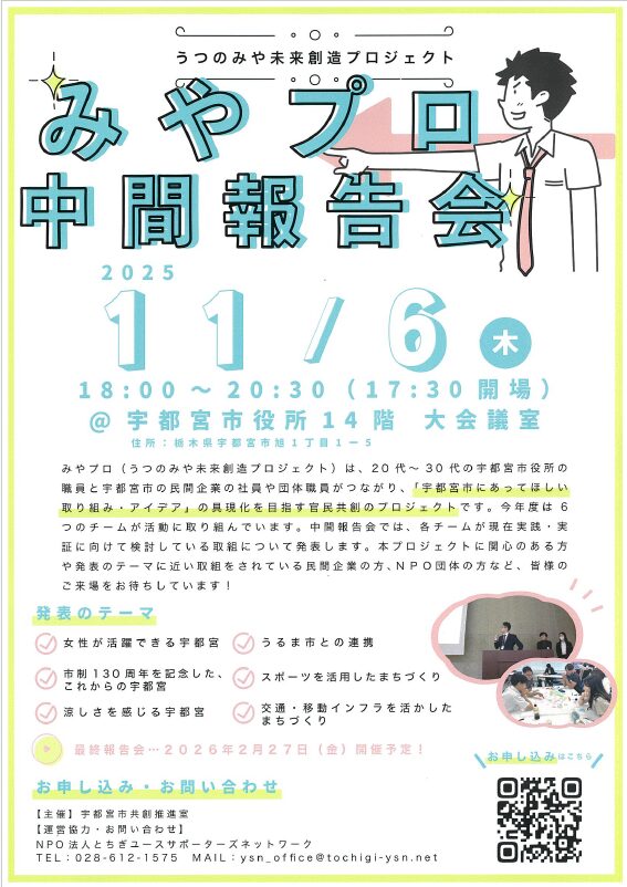 みやプロ(うつのみや未来創造プロジェクト)は、20代~30代の宇都宮市役所の職員と宇都宮市の民間企業の社員や団体職員がつながり、「宇都宮市にあってほしい取り組み・アイデア」の具現化を目指す官民共創のプロジェクトです。今年度は6つのチームが活動に取り組んでいます。中間報告会では、各チームが現在実践・実証に向けて検討している取組について発表します。本プロジェクトに関心のある方や発表のテーマに近い取組をされている民間企業の方、NPO団体の方など、皆様のご来場をお待ちしています!