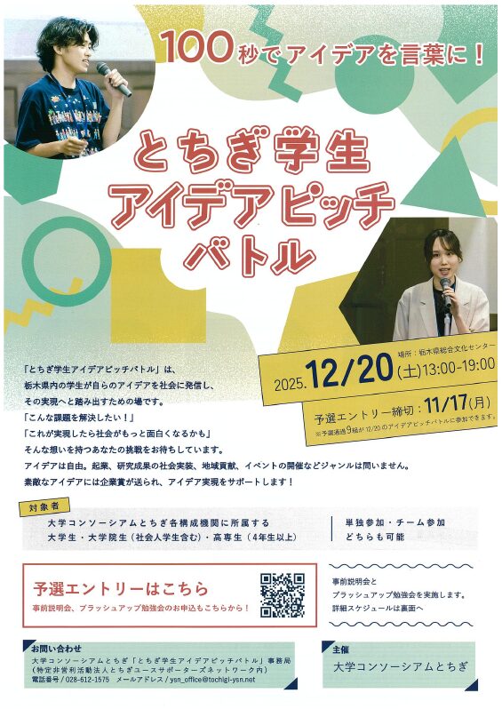 お問合せ | 大学コンソーシアムとちぎ「とちぎアイデアピッチバトル」事務局(NPO法人とちぎユースサポーターズネットワーク内) TEL:028-673-1575 MAIL:ysn_office@tochigi-ysn.net |