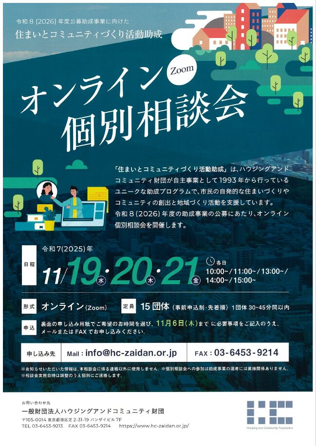 「住まいとコミュニティづくり活動助成」は、市民の自発的な住まいづくりやコミュニティの創出と地域づくり活動を支援しています。令和8(2026)年度は、「今日の住まいとコミュニティに関する多様な社会的課題に取り組む活動」に助成を行います。