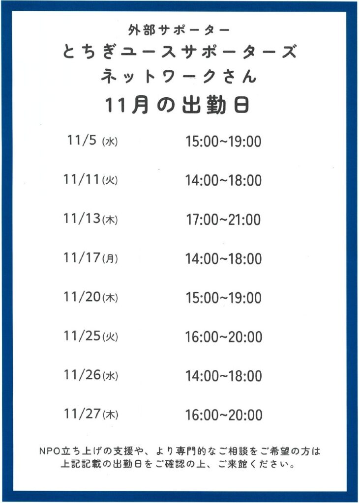 外部サポーターとしてまちぴあに参画されている、NPO法人とちぎユースサポーターズネットワークさんによる、NPO法人の立ち上げや運営に関する専門相談を実施しています。