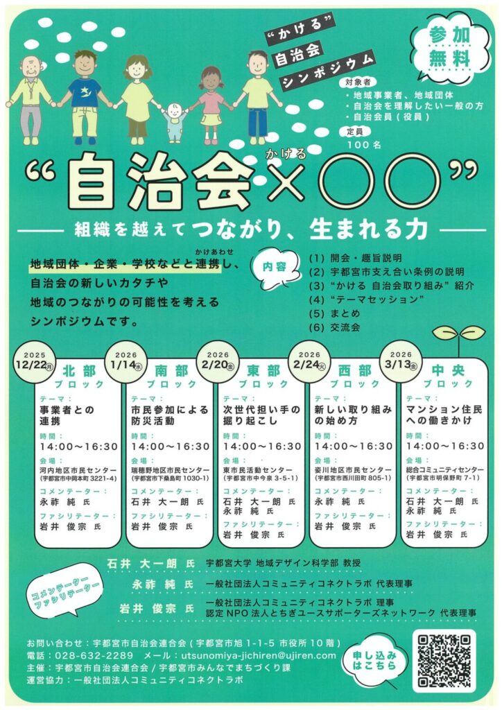 | 事前申込み・お問合せ | 事前申し込みは上部チラシQRより <お問い合わせ> 宇都宮市自治会連合会 〒320₋8540 宇都宮市旭1₋1₋5 宇都宮市役所10階 TEL 028₋632₋2289 E-mail utsunomiya-jichiren@ujiren.com |