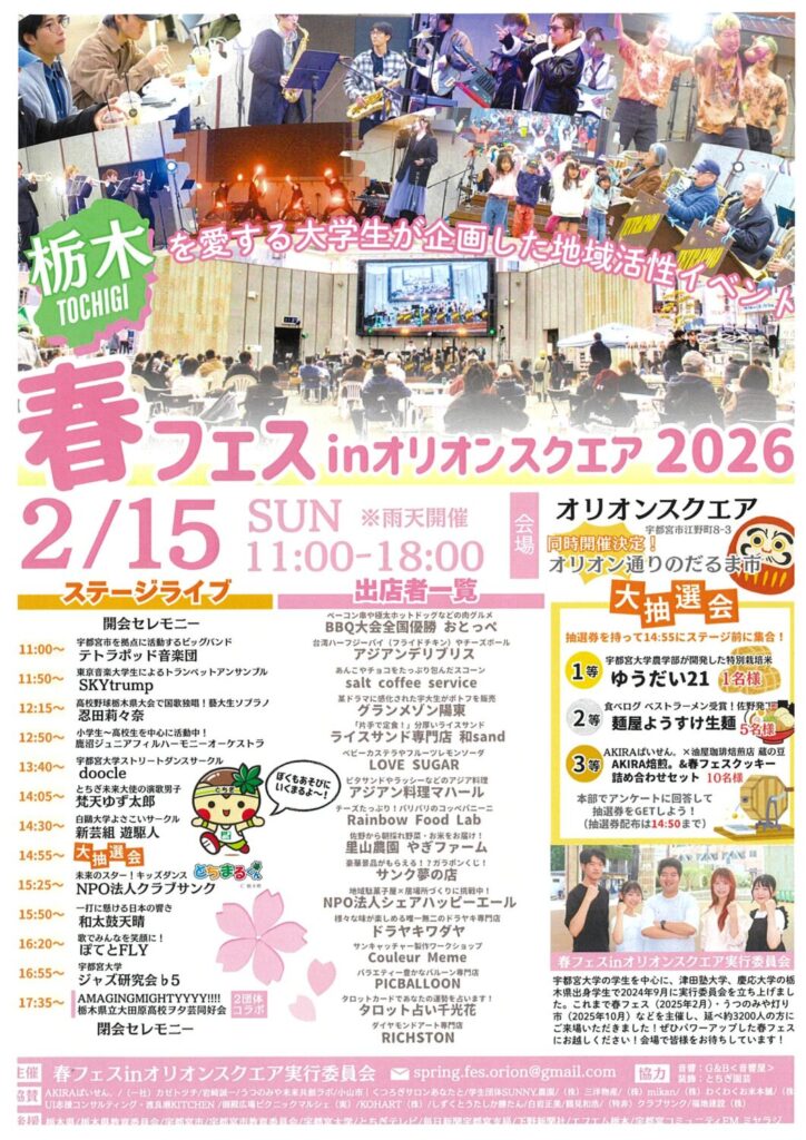 宇都宮大学の学生を中心に、津田塾大学、慶応大学の栃木県出身学生で構成された実行委員会が、栃木をイベントで盛り上げようと、オリオンスクエアで3回目となる主催イベント「春フェスinオリオンスクエア」を開催します!前回開催時は約2800人が来場しました!