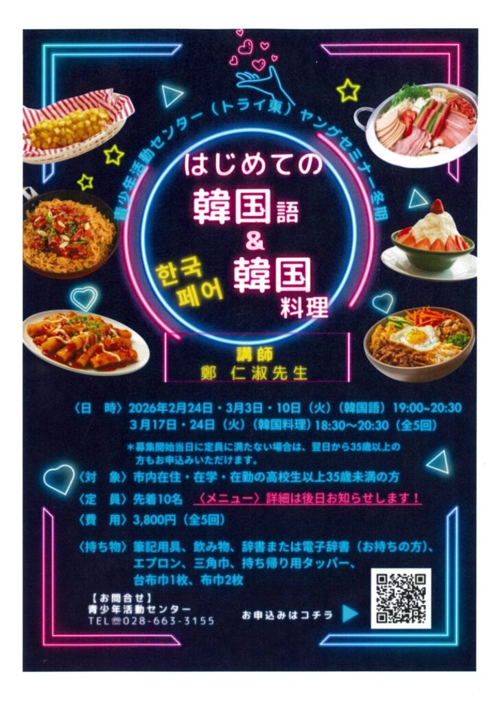 青少年活動センター(トライ東)ヤングセミナーとして、講師に鄭仁淑先生をお招きし、初心者向けの韓国語講座や韓国料理作り体験(前回開催時はチヂミやチーズタッカルビなど)を楽しむことができます!ぜひご参加ください!