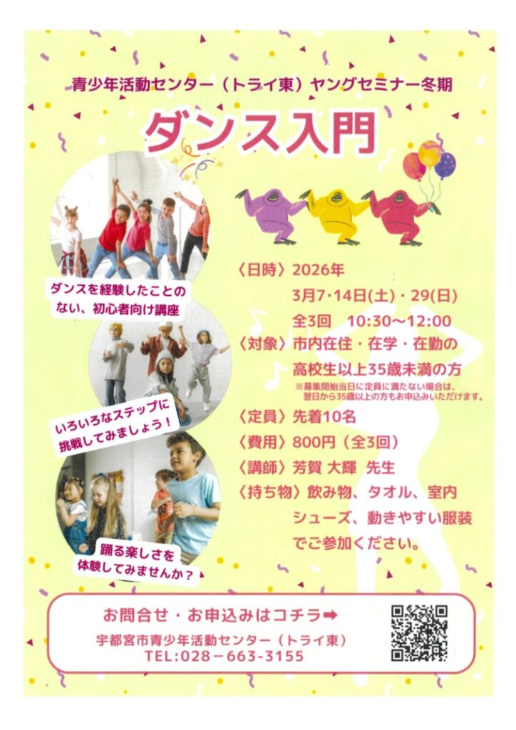 宇都宮市青少年活動センター(トライ東)のヤングセミナーとして、講師に芳賀大輝先生をお招きし、初心者向けにダンス講座を開講します!身体を動かしたい方・ダンスをやってみたい方、ぜひご参加ください!