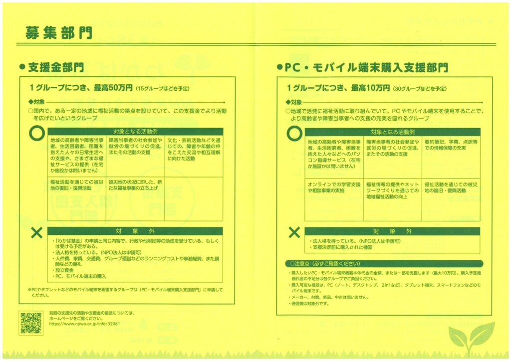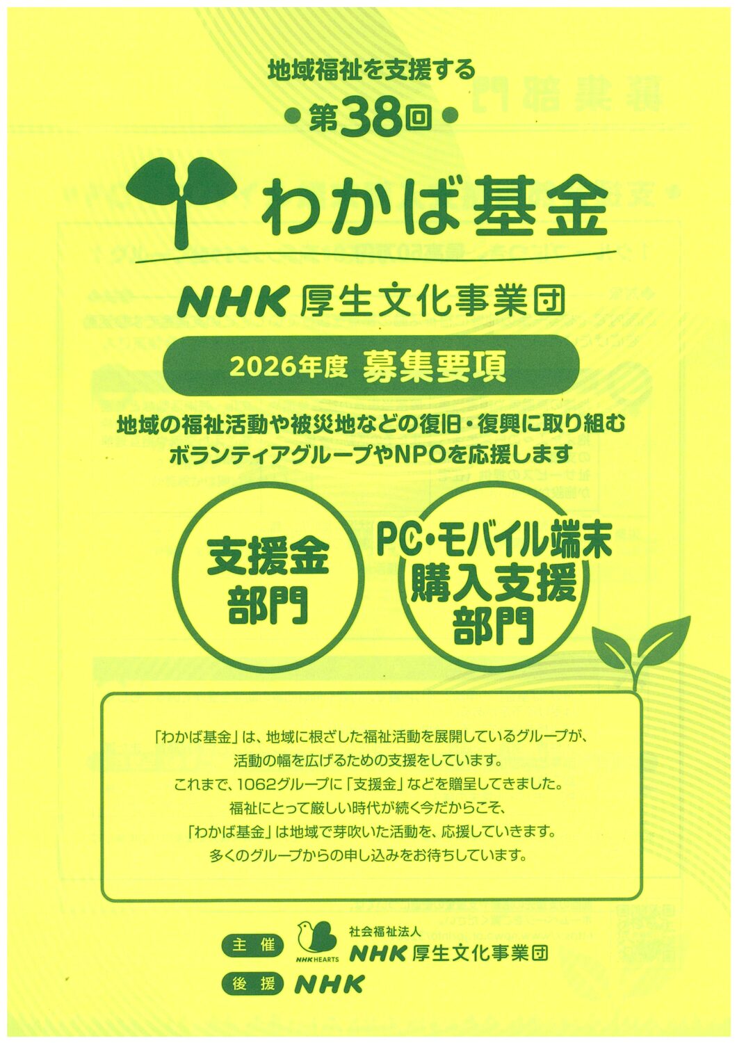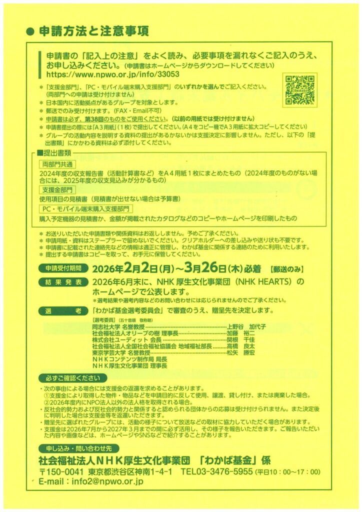 | 申し込み・問い合わせ先 | 社会福祉法人NHK厚生文化事業団「わかば基金」係 〒150-0041 東京都渋谷区神南1-4-1 ☎ 03-3476-5955(平日10:00~17:00) ✉ info2@npwo.or.jp |