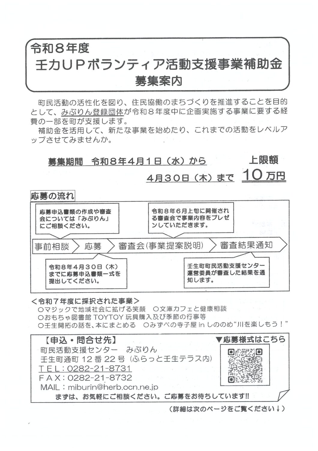 町民活動の活性化を図り、住民協働のまちづくりを推進することを目的として、みぶりん登録団体が令和8年度中に企業実施する事業に要する経費の一部を町が支援します。