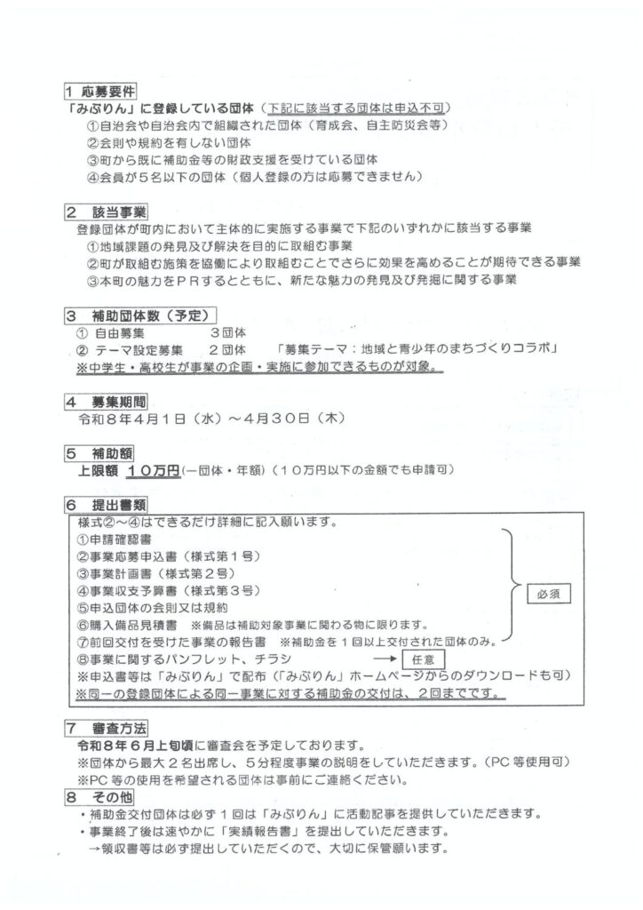| 応募要件 | 「みぶりん」に登録している団体(下記に該当する団体は申込不可) ①自治会や自治会内で組織された団体(育成会、自主防災会等) ②会則や規則を有しない団体 ③町から既に補助金等の財政支援を受けている団体 ④会員が5名以下の団体(個人登録の方は応募できません) |