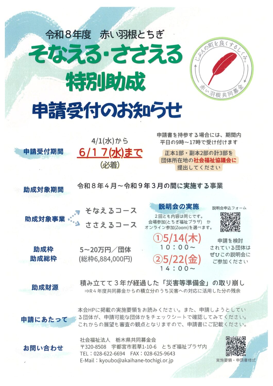 令和8年度 赤い羽根とちぎ「そなえる・ささえる特別助成」申請受付のお知らせ