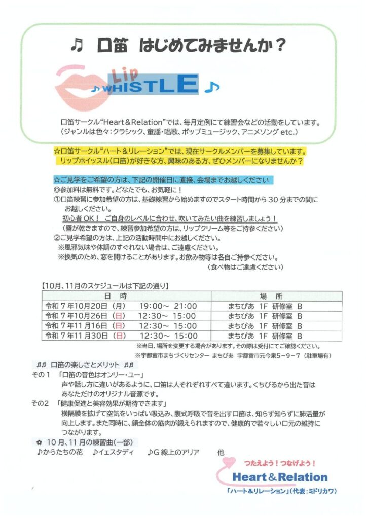 「口笛はじめてみませんか?」ハート&リレーション メンバー募集♪