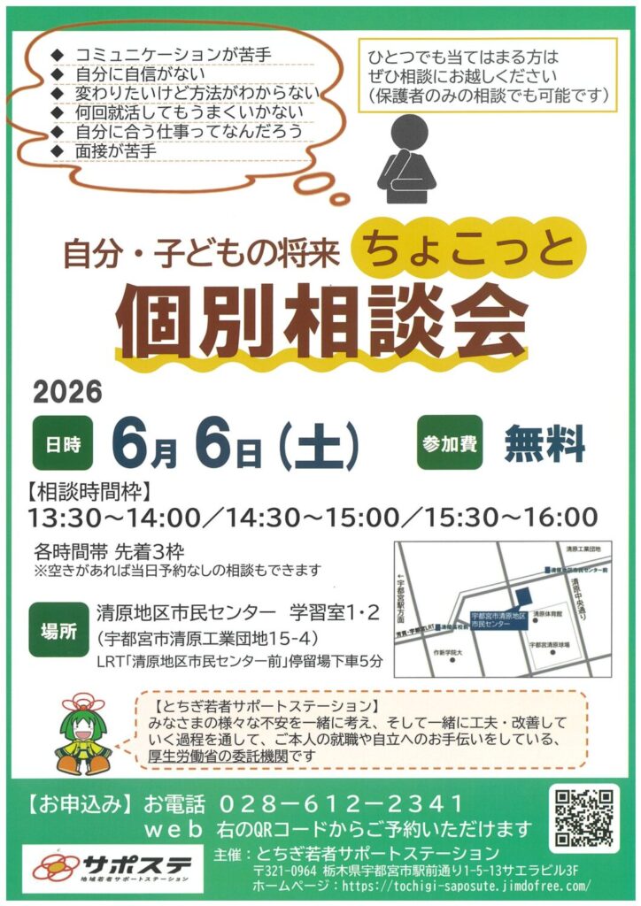 内容 ◆コミュニケーションが苦手◆自分に自信がない◆変わりたいけど方法がわからない◆何回就活してもうまくいかない◆自分に合う仕事ってなんだろう◆面接が苦手ひとつでも当てはまる方はぜひ相談にお越しください(保護者のみの相談でも可能です) 【とちぎ... -