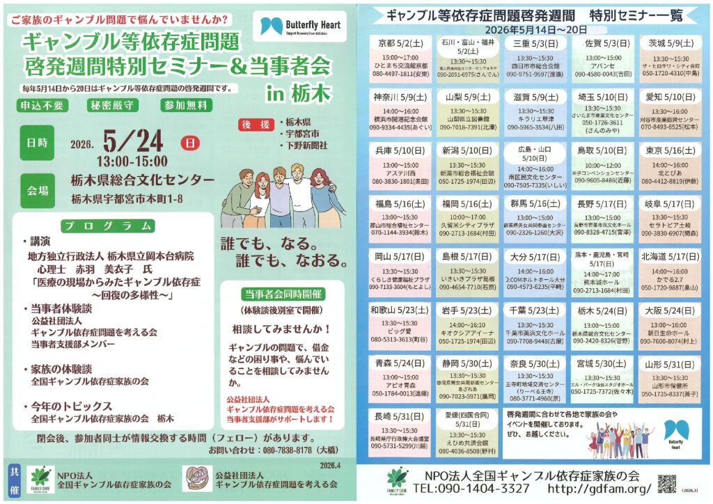 5/24(日)ギャンブル等依存症問題啓発週間特別セミナー&当事者会in栃木【申込不要/秘密厳守/無料】