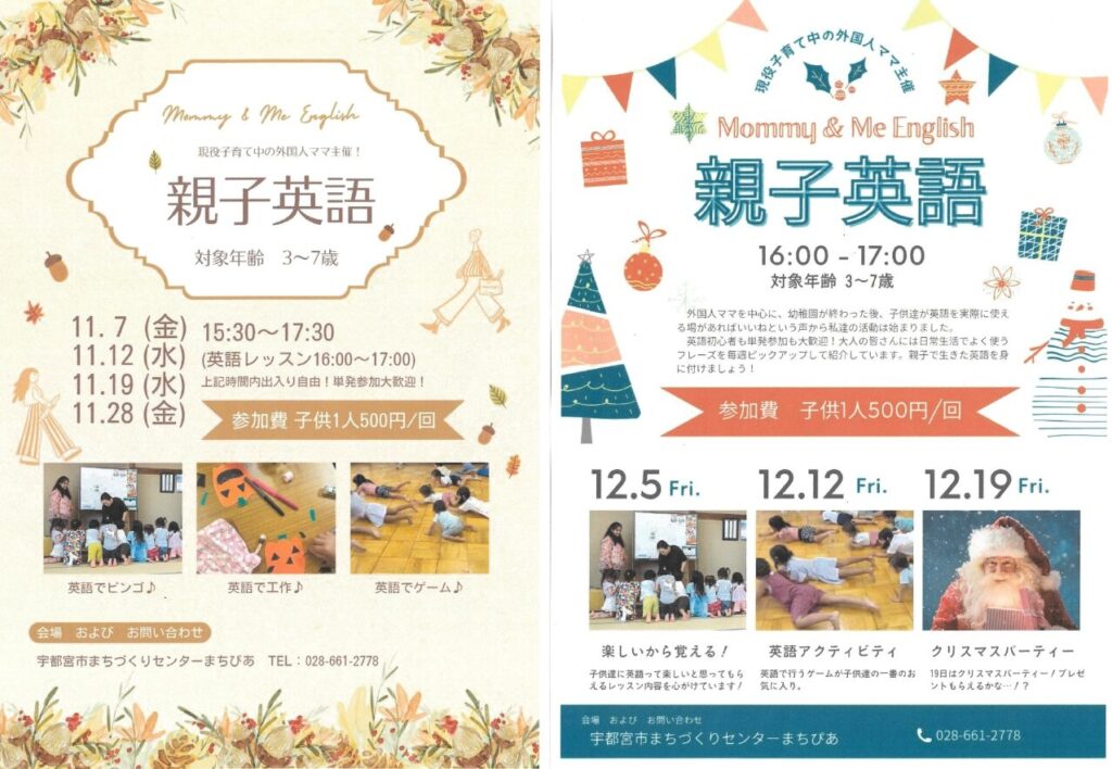 内容 Mommy&MeEnglishさん主催、現役子育て中の外国人ママによる!親子英語(3~7才対象)です♪ 日時11月(7日、12日、19日、28日)12月(5日、12日、19日)15:30~17:30(英語レッスン16:00~17:00) 時間内出入り自由!単発参加歓迎! 場所宇都宮市まち... -