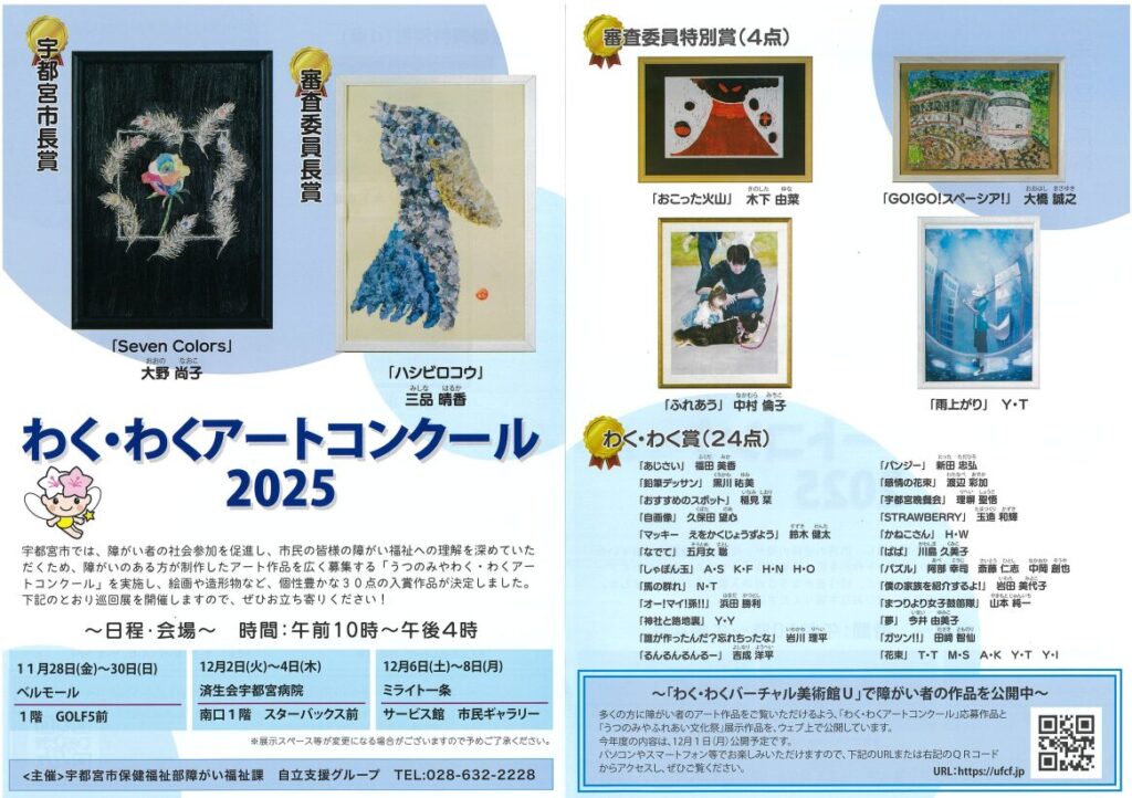 内容 宇都宮市では、障がい者の社会参加を促進し、市民の皆様の障がい福祉への理解を深めていただくため、障がいのある方が制作したアート作品を広く募集する「うつのみやわく・わくアートコンクール」を実施し、絵画や造形物など、個性豊かな30点の入賞作... -