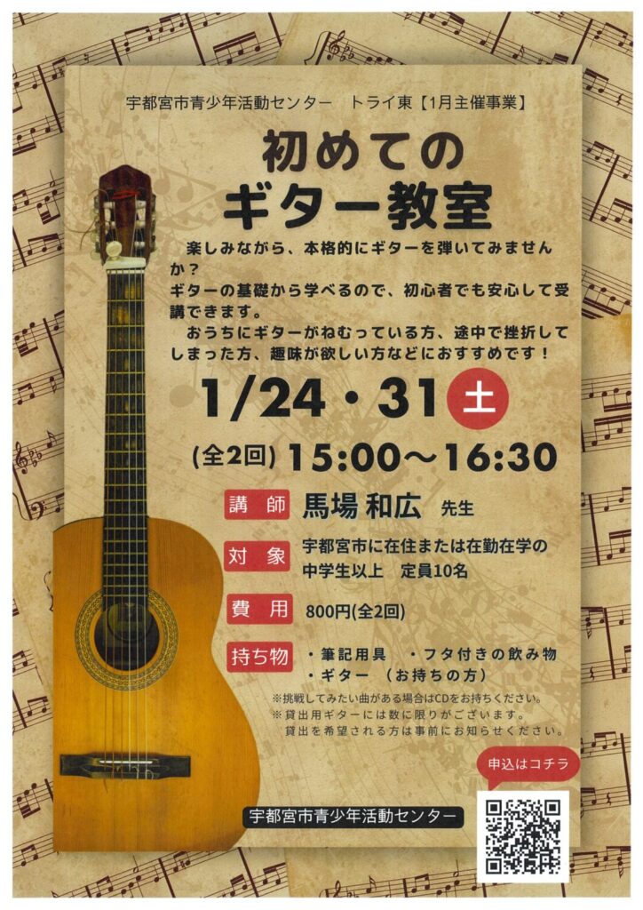 内容 宇都宮市青少年活動センター「トライ東」の主催事業として”初めてのギター教室”を開講します。楽しみながら、本格的にギターを弾いてみませんか?ギターの基礎から学べるので、初心者でも安心して受講できます。おうちにギターが眠っている方、趣味... -