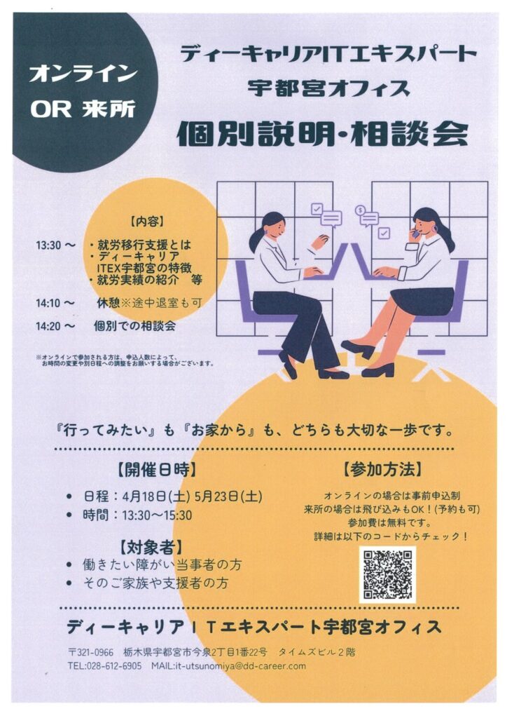 4/18(土), 5/23(土) ディーキャリアITエキスパート宇都宮オフィス 個別説明・相談会