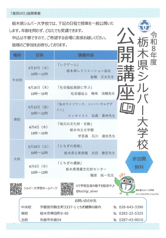 「県民の日」協賛事業 令和8年度栃木県シルバー大学校 公開講座📚【参加無料】