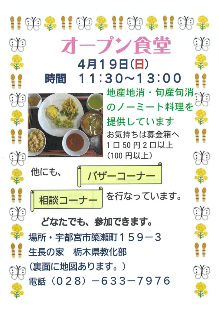 内 容 地産地消・旬産旬消のノーミート料理を提供していますお気持ちは募金箱へ 1口50円、2口以上(100円以上) 他にも、バザーコーナーや相談コーナーを行なっています。 どなたでも、参加できます。 日時4月19日(日) 11:30~13:00 場所宇都宮市... -