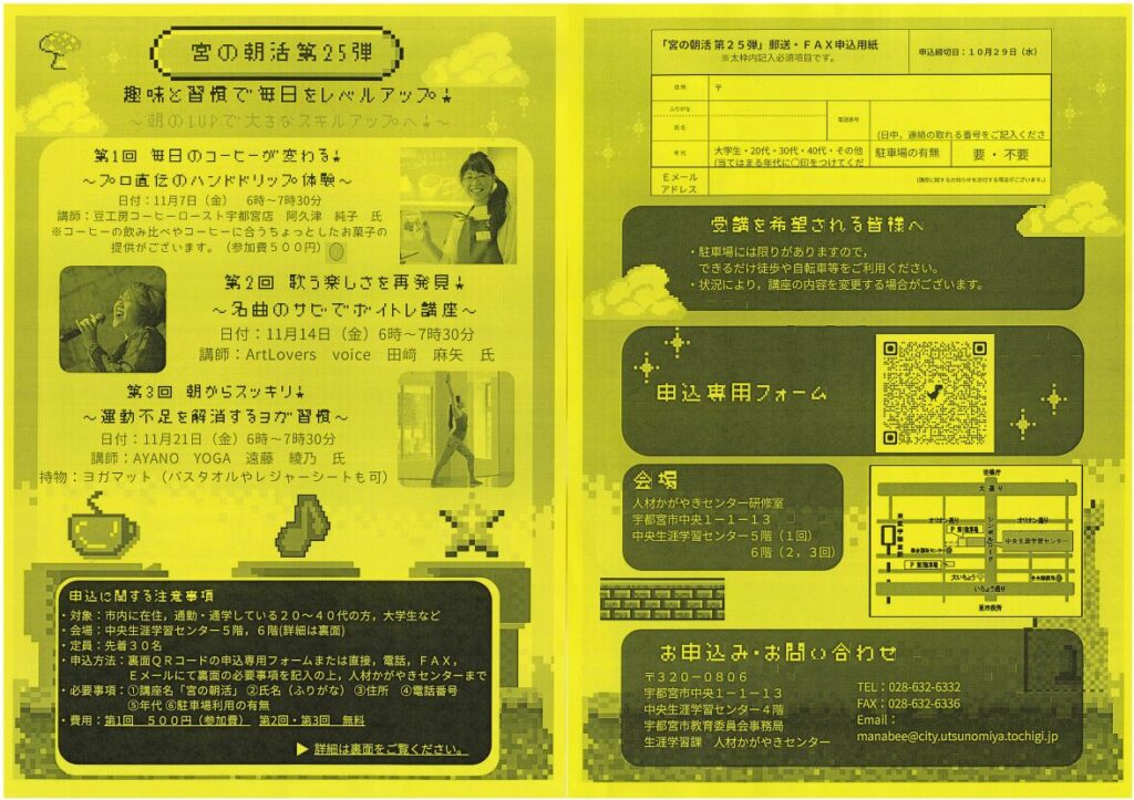 内容 ~朝の1UPで大きなスキルアップへ!~ 第1回 毎日のコーヒーが変わる!ープロ直伝のハンドドリップ体験ー11月7日(金) 6時~7時30分 ※参加費500円 第2回 歌う楽しさを再発見!ー名曲のサビでボイトレ講座ー11月14日(金) 6時~7時30日 第3回 朝か... -