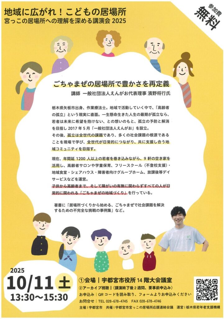 内容 ごちゃまぜの居場所で豊かさを再定義講師一般社団法人えんがお代表理事 濱野将行氏 日時2025年10月11日(土) 13:30~15:30 場所宇都宮市役所14階大会議室アーカイブ視聴 ※要事前申込み お問い合わせ先主催:宇都宮市共催:宇都宮市... -