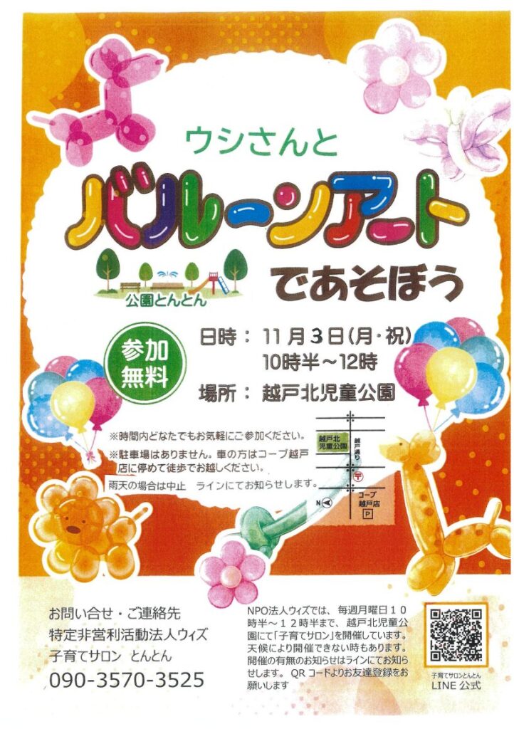 内容 日時2025年11月3日(月・祝) 10:30~12:00 場所越戸北児童公園 参加費無料 お問い合わせ先特定非営利活動法人ウィズ子育てサロン とんとん☎ 090-3570-3525 -