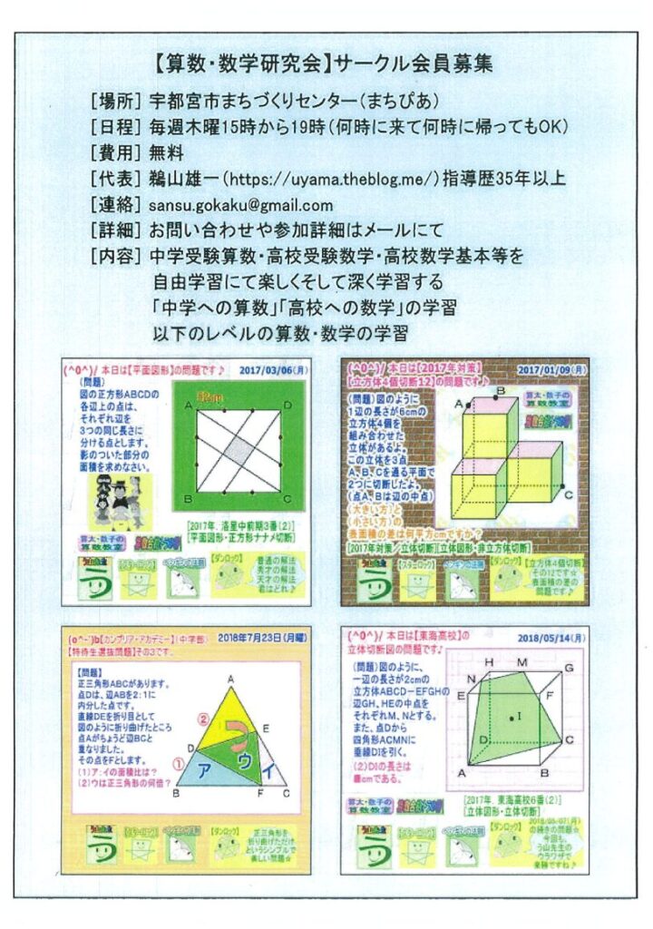 内容 中学受験算数・高校受験数学・高校数学基本等を自由学習にて楽しくそして深く学習する「中学への算数」「高校への数学」の学習以下のレベルの算数・数学の学習 日時毎週木曜15時から19時(何時に来て何時に帰ってもOK) 場所宇都宮市まち... -