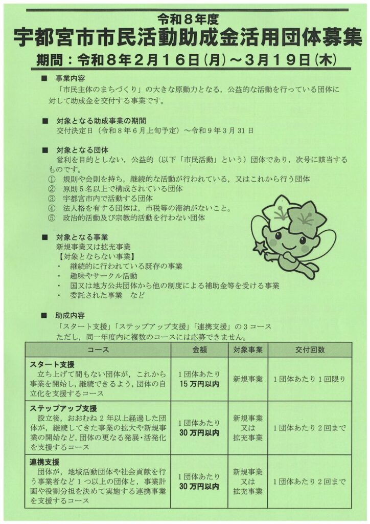 令和8年度「宇都宮市市民活動助成金」活用団体募集のお知らせ